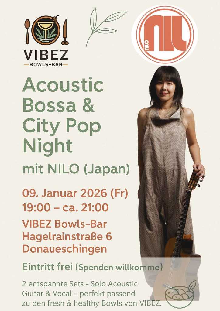 Wir freuen uns darauf, die Künstlerin NILO am Freitag, den 09. Januar 2026 in der VIBEZ Bowls-Bar in Donaueschingen begrüßen zu dürfen. Auf dem letzten Herbstfest kamen wir bereits in den Genuss ihrer abwechslungsreichen Musik – eine Mischung aus japanischem City-Pop, Anime-Songs und eigenen Kreationen – und so sind wir gespannt darauf, wie sie im Januar mit einem Solo-Auftritt das neue Jahr begrüßt.